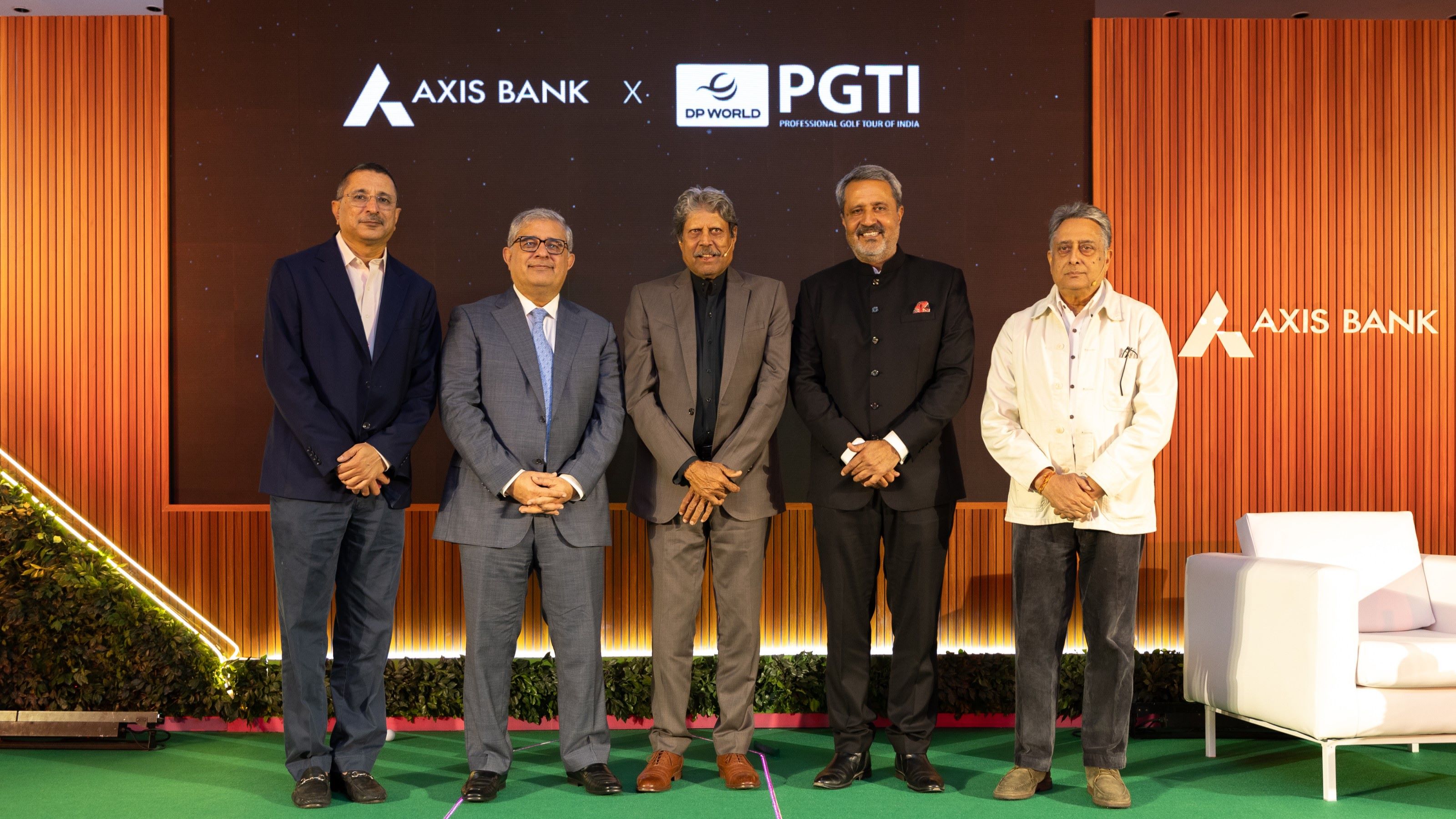 L - R: Mr. Munish Sharda, Executive Director, Axis Bank, Mr. Amitabh Chaudhry, MD & CEO, Axis Bank, Mr. Kapil Dev, President, PGTI, Mr. Amandeep Johl, CEO, PGTI & Mr. Amrit Mathur, League Commissioner of PGTI's 72 The League, seen at the DP World PGTI and Axis Bank partnership announcement ceremony in New Delhi on Friday
