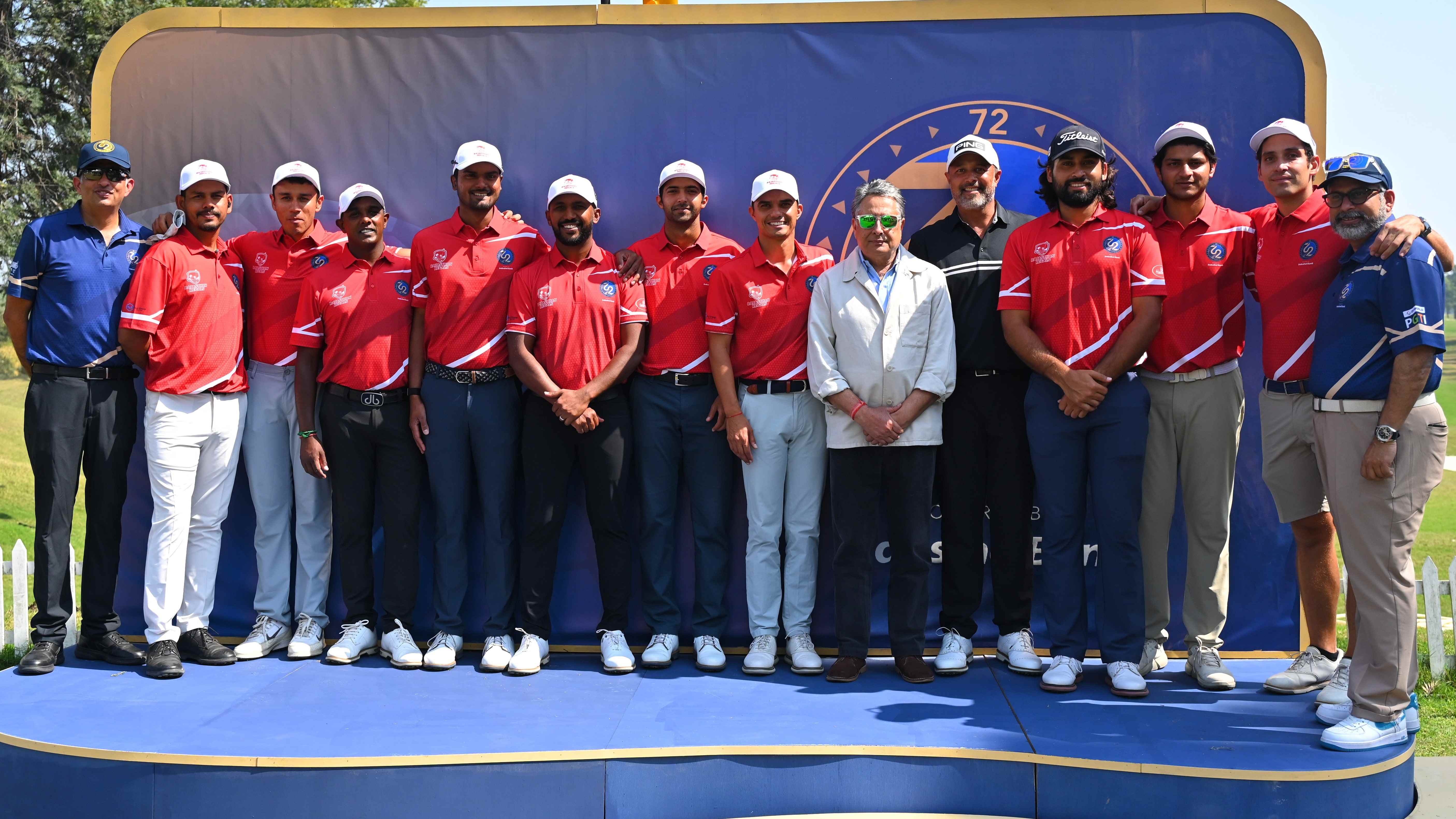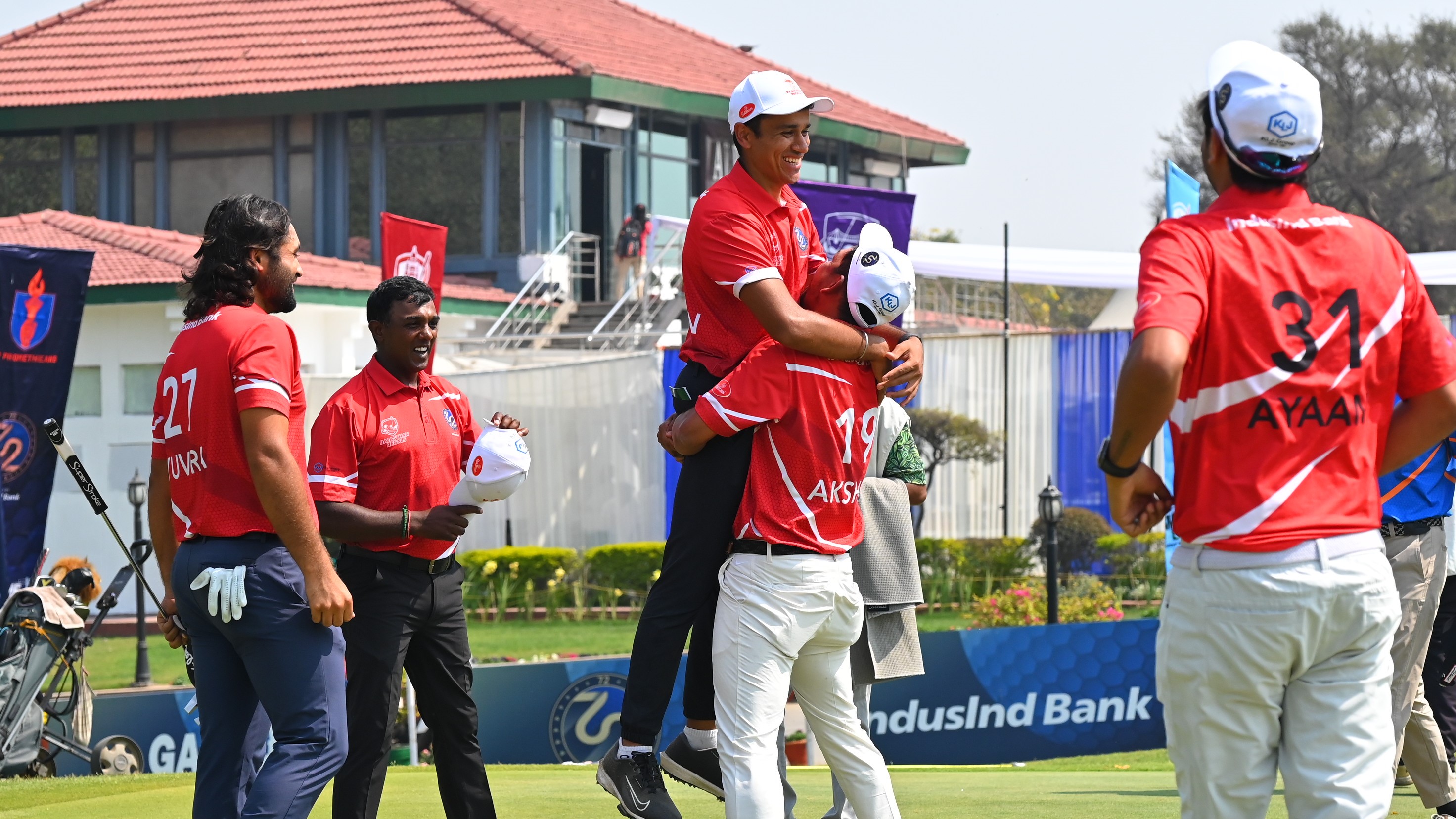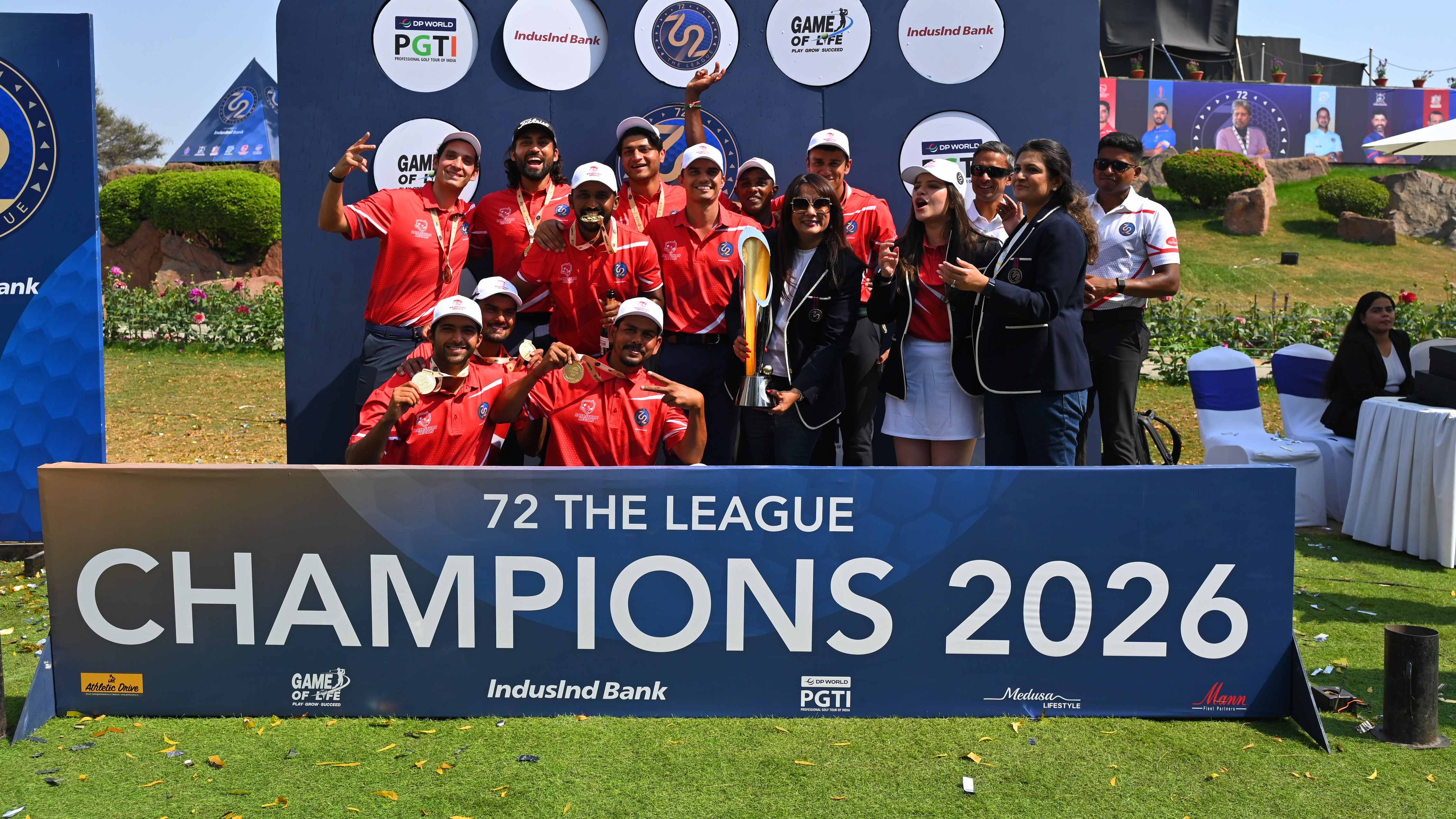 72 The League 2026: The UP Prometheans seen celebrating their passage into the Final after finishing as the top-ranked team in the League Standings; The celebration followed after the UP Prometheans' duo of Manoj S and Abhinav Lohan halved their Fourball match against Rajasthan Regals