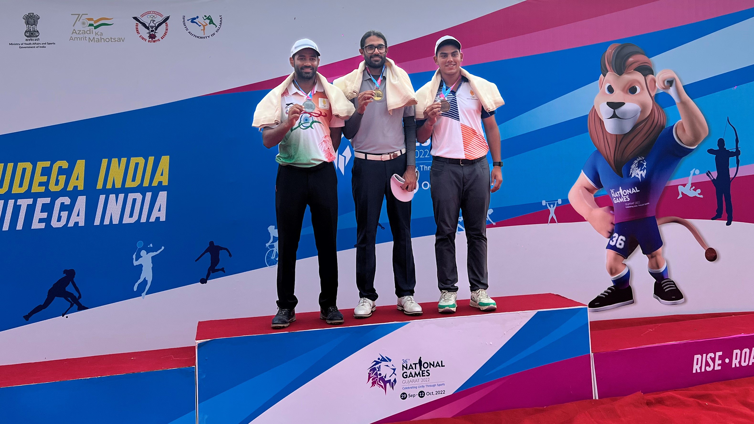 Chandigarh's Karandeep Kochhar (Gold) and the Haryana duo of Abhinav Lohan (Silver) and Sunhit Bishnoi (Bronze) pose with their medals from the Men's Golf Individual Event at the 36th National Games in Gujarat