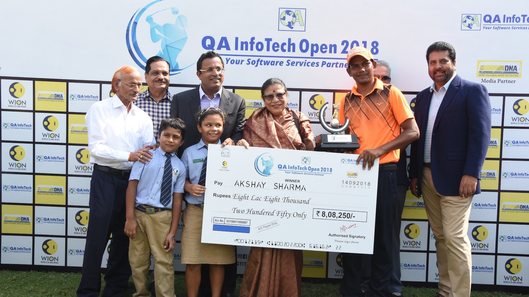 QA InfoTech Open: Akshay Sharma receives the cheque from Mr. Mukesh Sharma, Founder & MD, QA InfoTech (3rd from left) and his parents Mr. K M Sharma (extreme left) and Mrs. K M Sharma (centre)