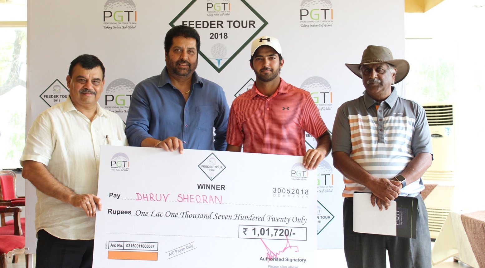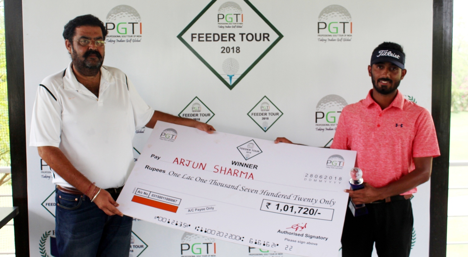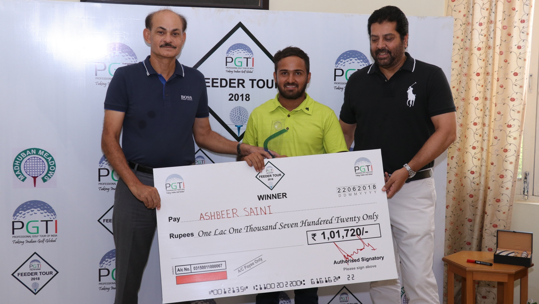 Feeder Tour, Karnal: Ashbeer Saini receives the winning cheque from Mr. K K Sindhu, IPS, DG, Haryana Police Academy, Madhuban (left) and Mr. Uttam Singh Mundy, CEO, PGTI (right)