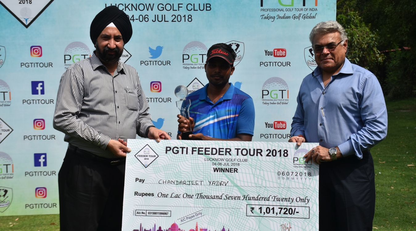 Feeder Tour, Lucknow: Chandarjeet Yadav (centre) receives the winner's cheque from Mr. JPS Sial, Captain, Lucknow Golf Club (left) and Mr. Rajnish Chopra, Secretary, Lucknow Golf Club (right)