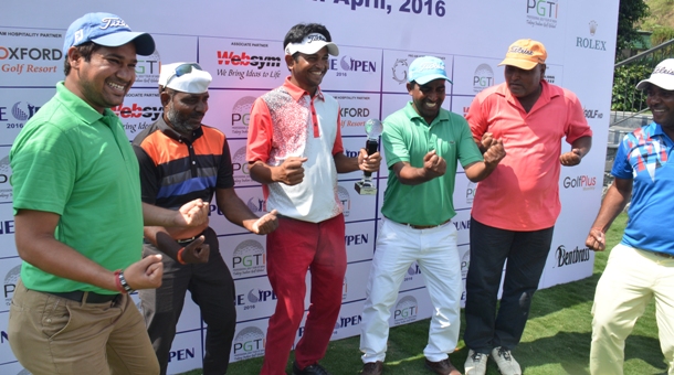 Pune Open: Harendra Gupta receives the winning cheque from Mr. Uttam Singh Mundy, Director, PGTI (centre) & Mr. Rohan Seolekar, Director, Oxford Golf Resort (right)