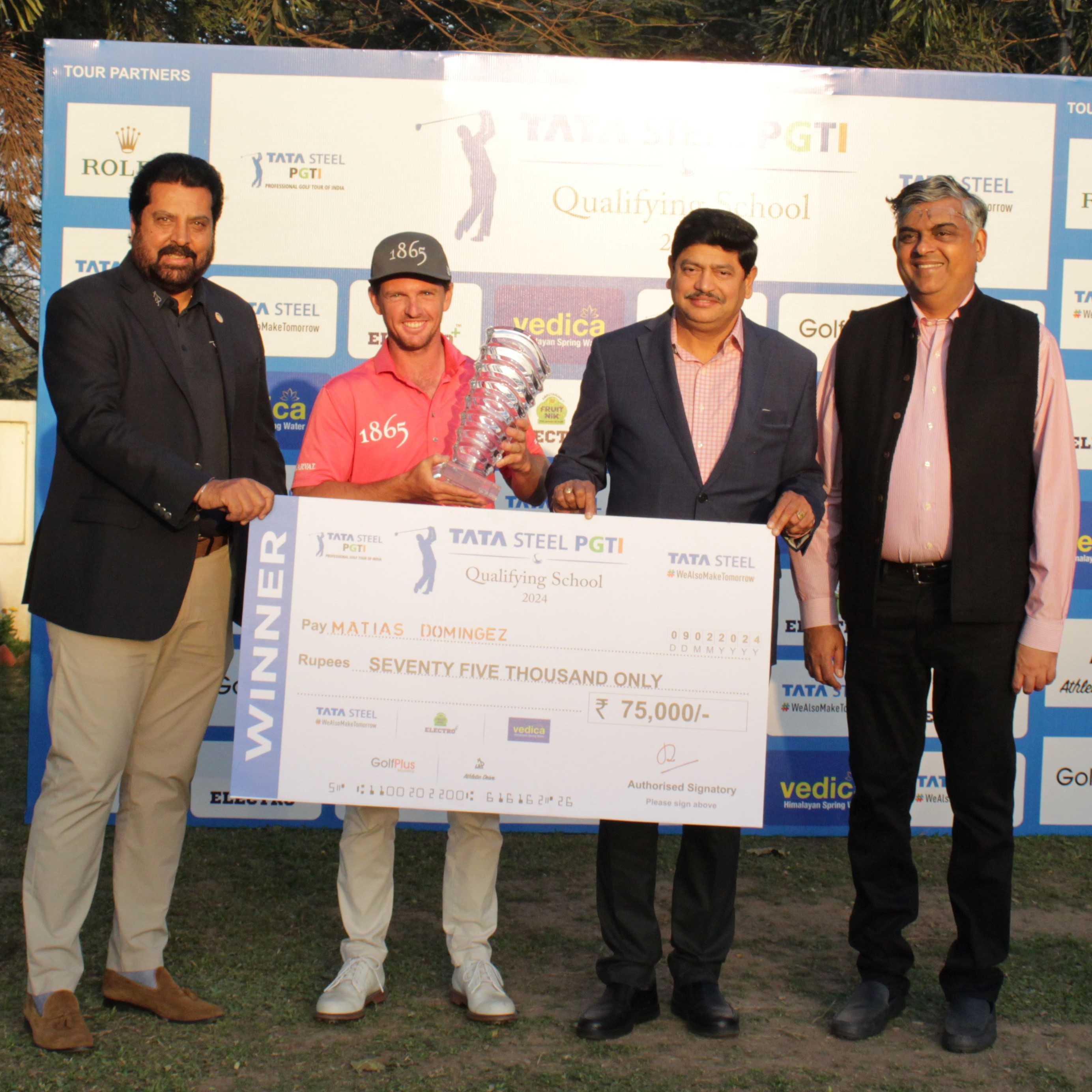 Chilean golfer Matias Dominguez (61-70-69-64) posted a final round of seven-under 64 to end up as the wire-to-wire champion with an impressive seven-shot margin at a total of 20-under 264 at the Final Qualifying Stage of the TATA Steel PGTI Qualifying School 2024 held at the Golmuri Golf Course in Jamshedpur.
