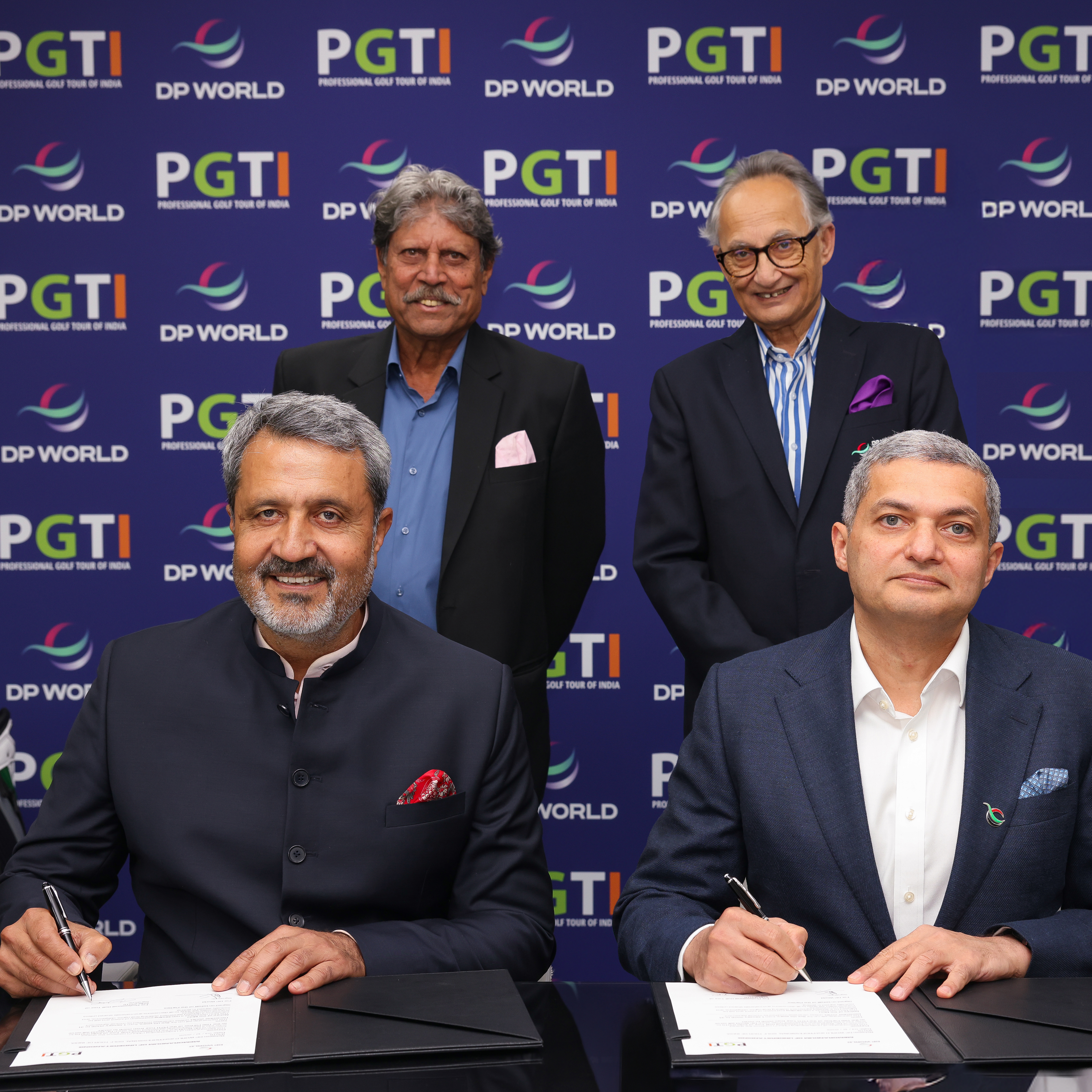 Mr. Rizwan Soomar, CEO & Managing Director, MENA & India Subcontinent, DP World (seated right) and Mr. Amandeep Johl, CEO, PGTI (seated left), seen signing the agreement. Mr. Kapil Dev, President, PGTI (standing left) and Mr. Yuvraj Narayan, Group Deputy CEO and Chief Financial Officer, DP World (standing right) are also seen in the picture.