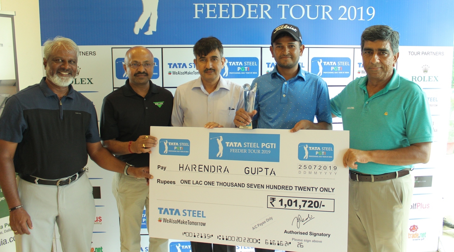 Feeder Tour, Faridabad: Harendra Gupta receives the winning cheque from (L - R) G Suresh, TD, PGTI, P Goyal, MD, Kelley India, N S Rawat from Aravalli GC & Y Bedi, Chief, Steel Recycling, TATA Steel