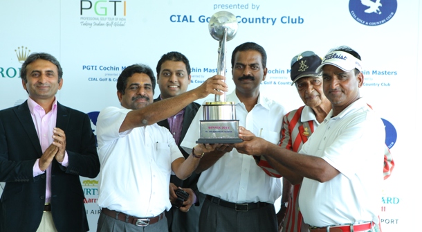 Mukesh Kumar receives the trophy from (r-l) Maj Gen KJ Koshi from CGCC, Mr AM Shabeer, ED, CIAL, Mr R Cornelio (Courtyard by Marriot), Mr ACK Nair, Airport Director, CIAL, Mr P Sandhu, Director, PGTI