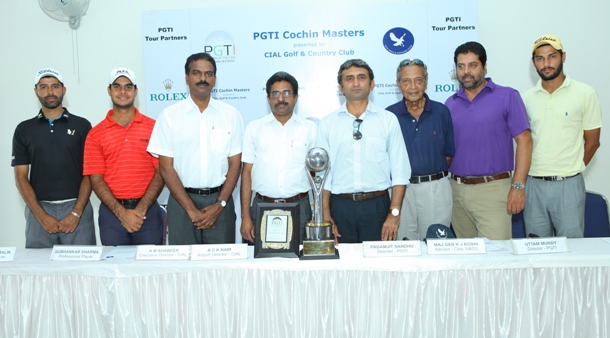 PGTI Cochin Masters: (L - R) Amardip Malik, Shubhankar Sharma, Mr AM Shabeer (CIAL), Mr ACK Nair (CIAL), Mr P Sandhu (PGTI), Maj Gen KJ Koshi (CGCC), Mr US Mundy (PGTI) & Angad Cheema at the press con