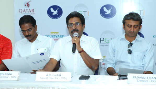 PGTI Cochin Masters: Mr. A C K Nair, Airport Director, CIAL, makes the opening address, seated to his right is Mr. A M Shabeer, Executive Director, CIAL