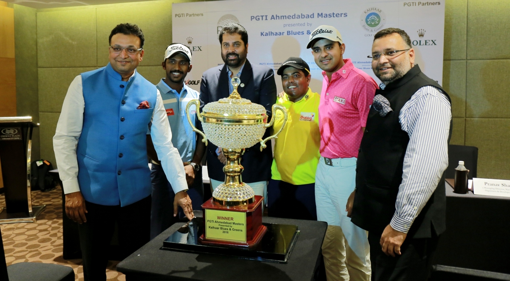 PGTI Ahmedabad Masters: (l - r) Devang Shah, MD, Navratna, Chikkarangappa, U S Mundy, Director, PGTI, Mithun Perera, Khalin Joshi & Pranav Shah, MD, Navratna, pose with the trophy at the press con