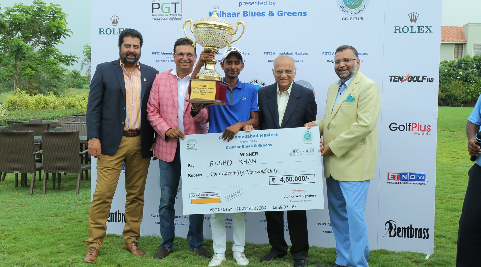 PGTI Ahmedabad Masters: Rashid Khan receives the cheque from (r - l) Pranav Shah, MD, Navratna Group, Dinesh Shah, Chairman, Navratna Group, Devang Shah, MD, Navratna Group & U S Mundy, Director, PGTI
