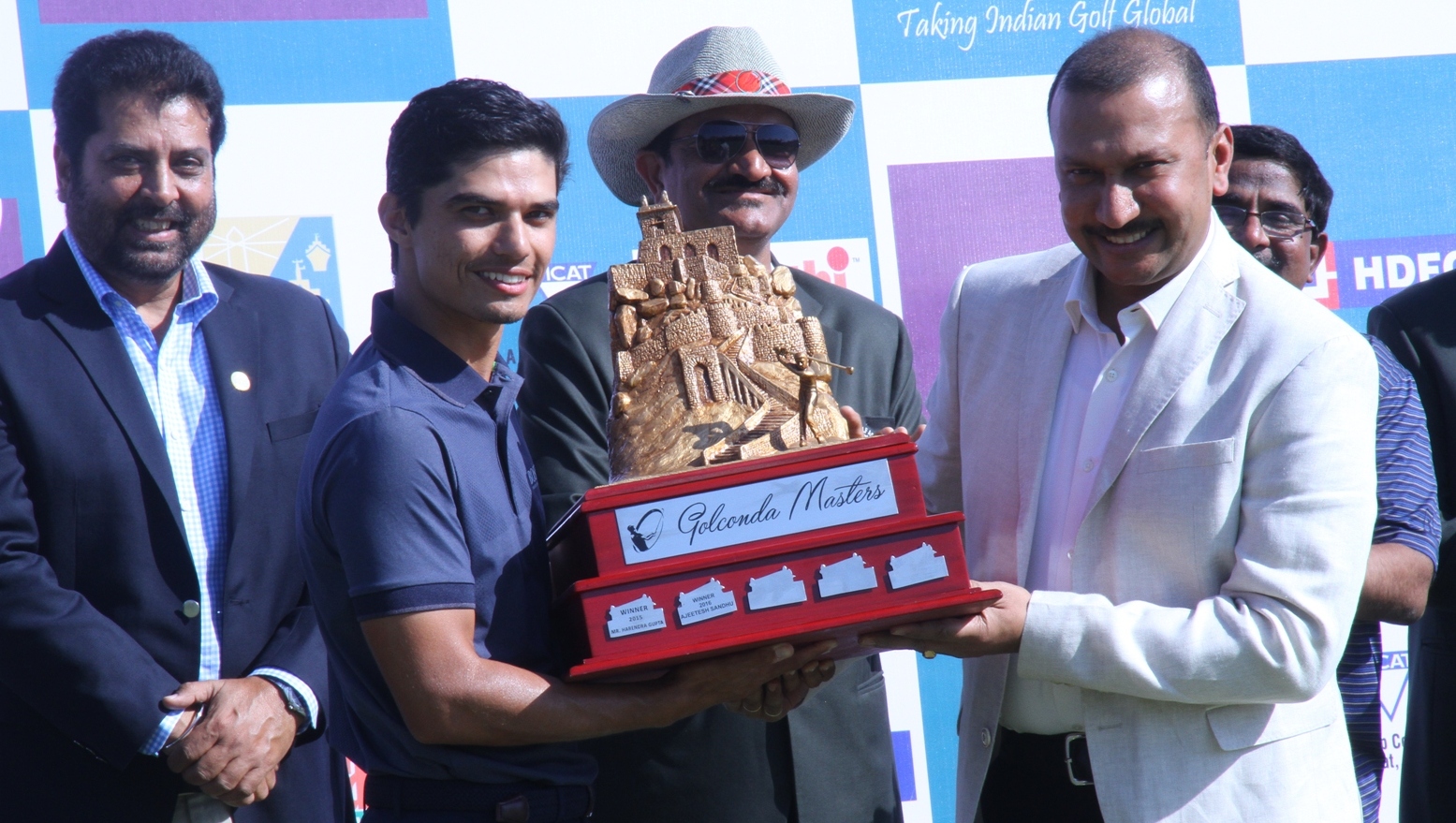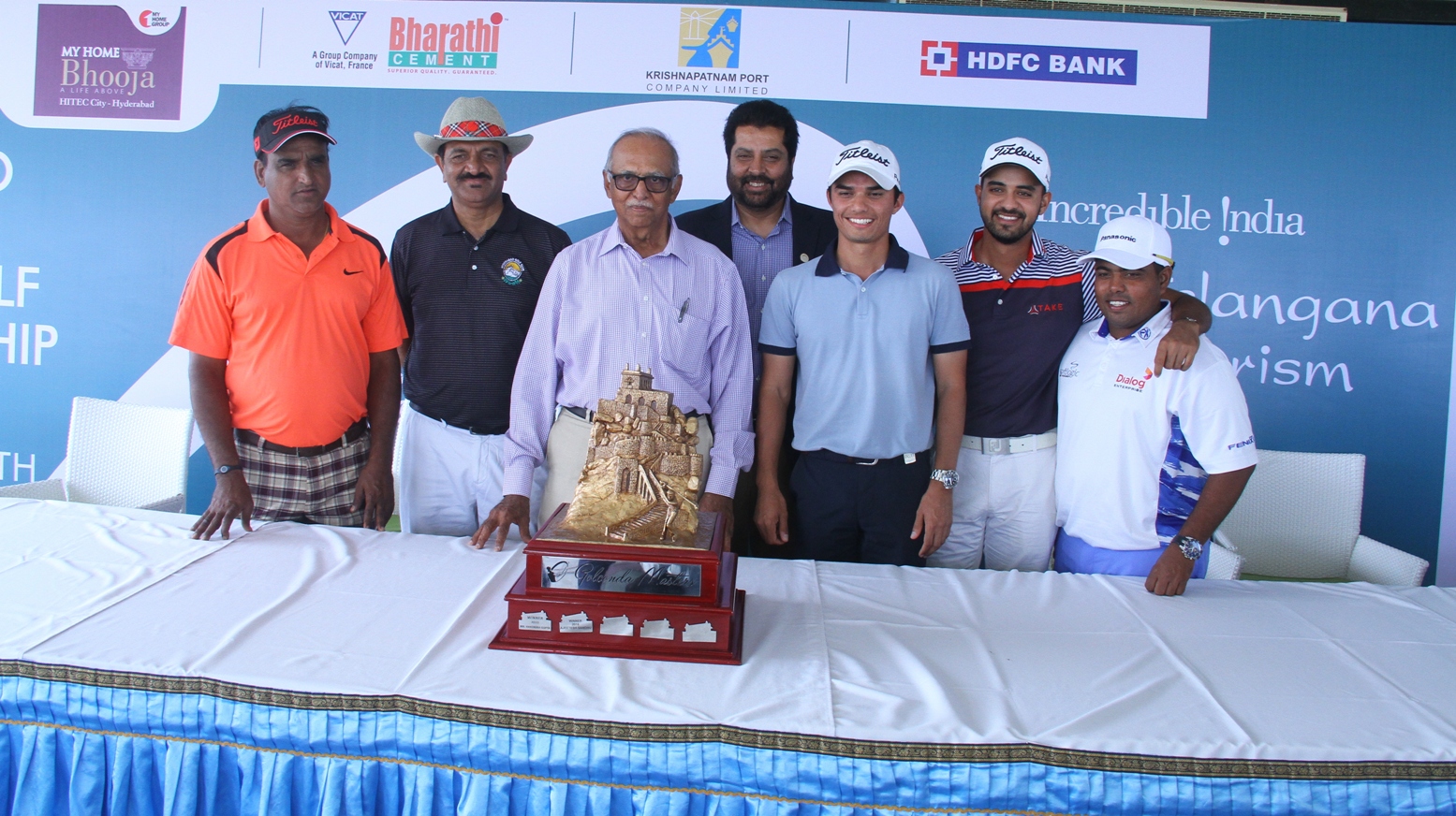 Golconda Masters: (L - R) Mukesh Kumar, C Dayakar Reddy, Capt, HGA, J Vikramdev Rao, President, HGA, U S Mundy, Director, PGTI, Ajeetesh Sandhu, Khalin Joshi & Mithun Perera pose with the trophy