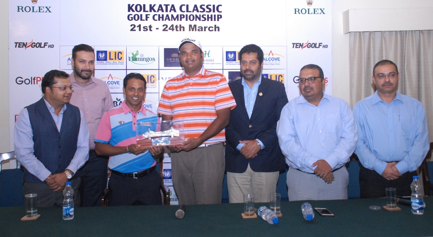 Kolkata Classic: (L - R) P Jalan (Flamingos), Y Shroff (Alcove), pros SSP Chawrasia & Udayan Mane, U S Mundy (CEO, PGTI), G Ghosh (RCGC) & Col. D Singhal (RCGC), pose with the trophy at the press meet