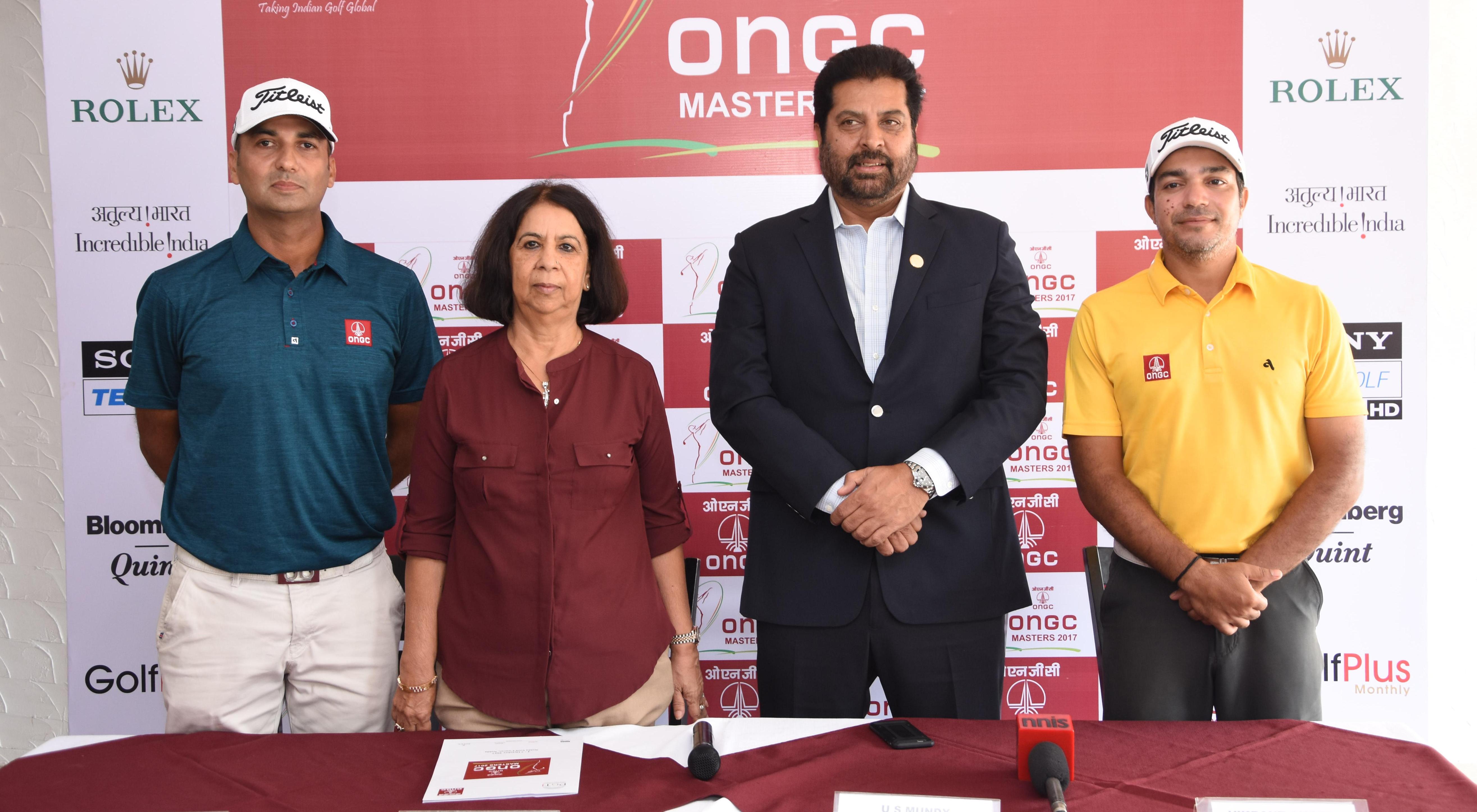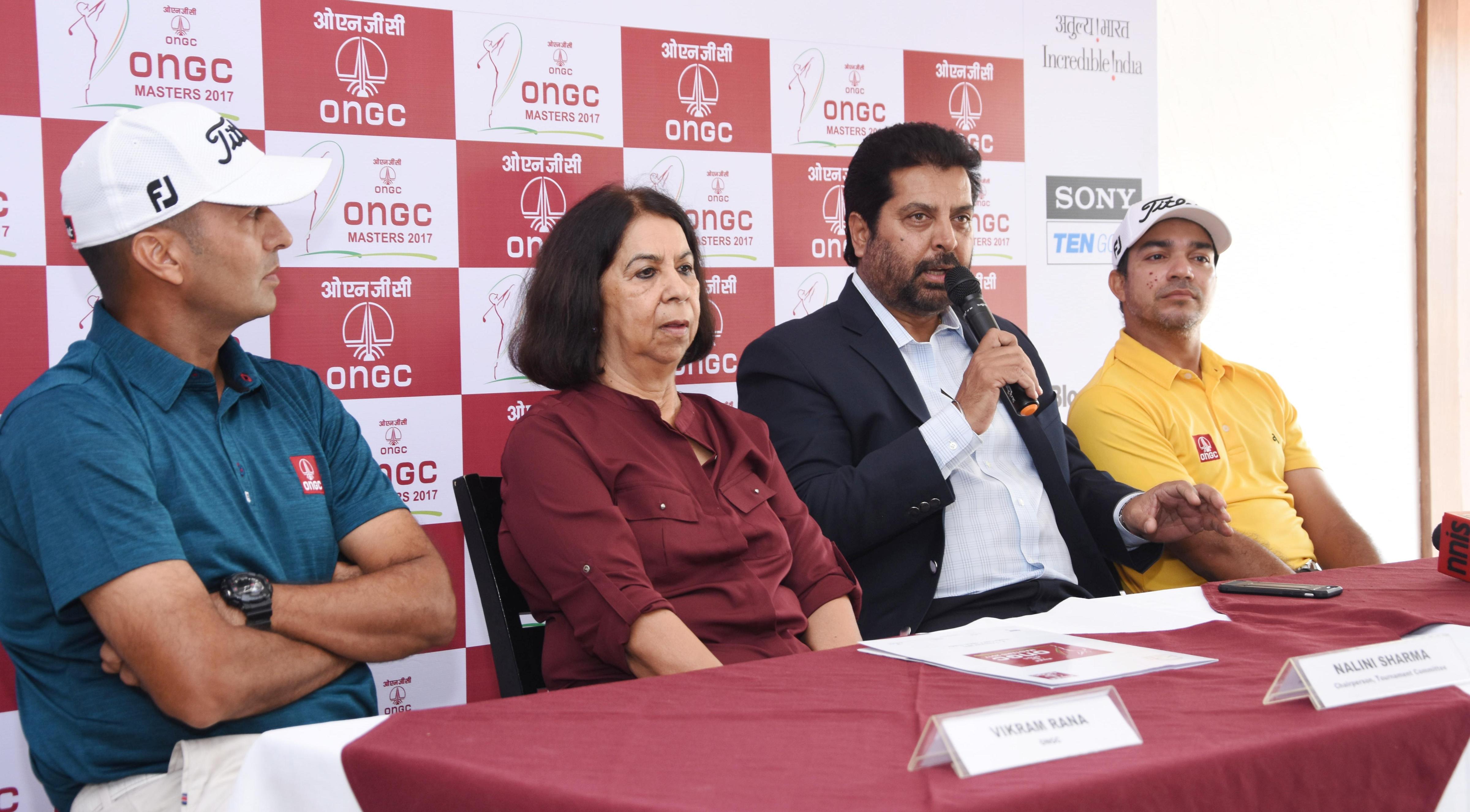 ONGC Masters: (L - R) Professional Vikram Rana (ONGC), Nalini Sharma, Chairperson, Tournament Committee, Noida GC, Uttam Singh Mundy, CEO, PGTI, professional Vikrant Chopra (ONGC) at the press con
