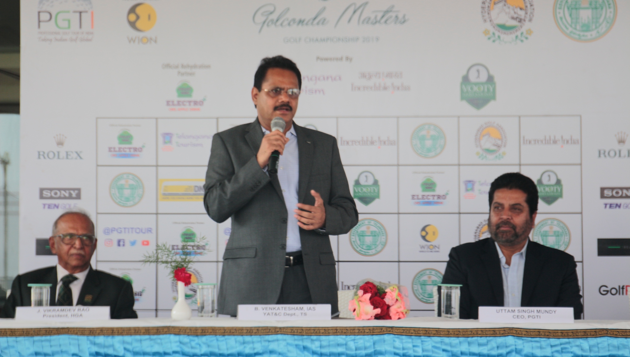 Golconda Masters: Mr. B Venkatesham, IAS, Principal Secy, YAT & C Dept, Govt of Telangana, addresses the media, he is flanked by Mr. J Vikramdev Rao, President, HGA (L) & Mr. U S Mundy, CEO, PGTI (R)