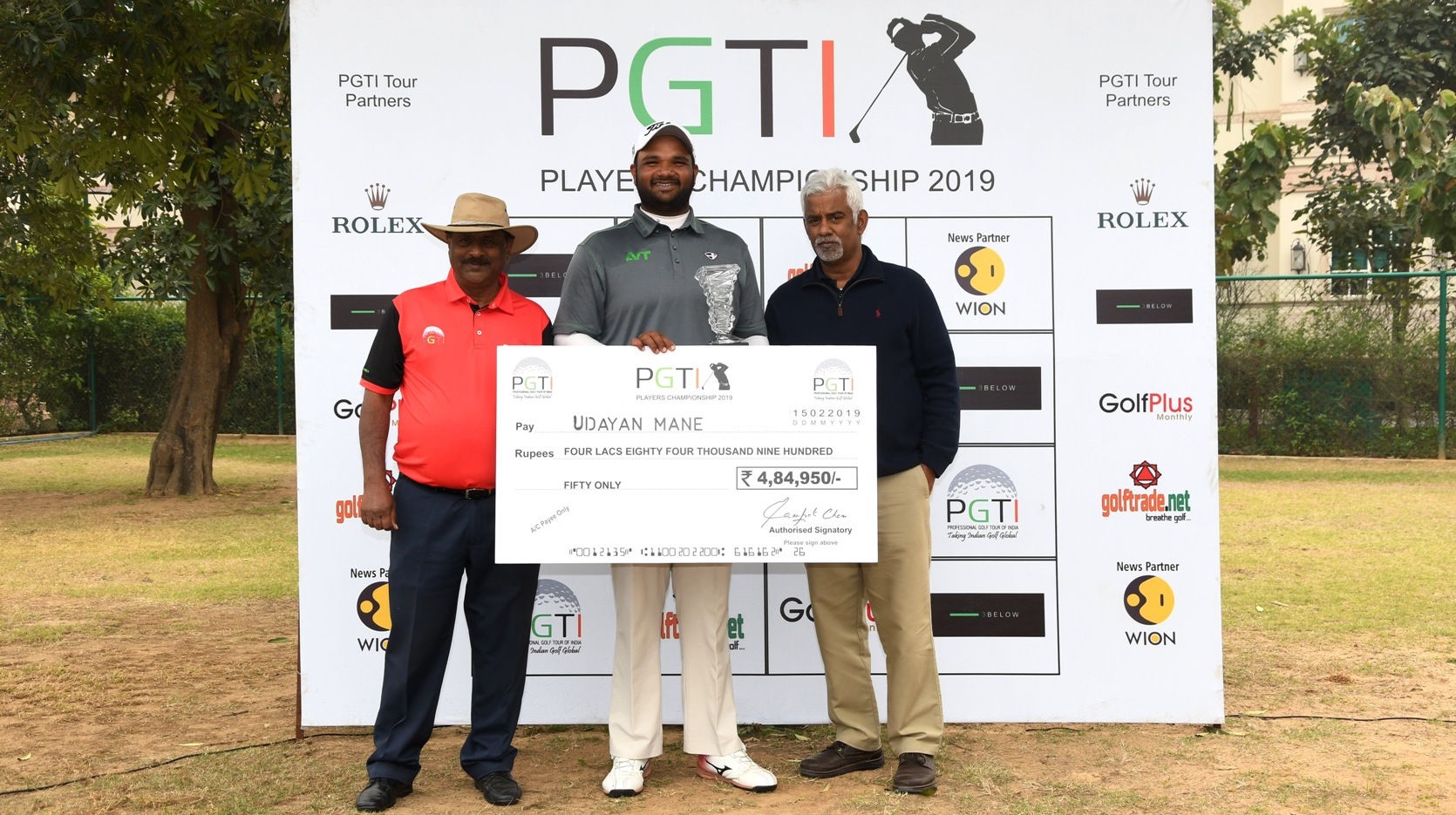 Players C'ship, Classic: Udayan Mane receives the winner's cheque from Mr. Sampath Chari, Tournament Director, PGTI (left) and Mr. B Hariharan, Managing Director, Landbase India (right)