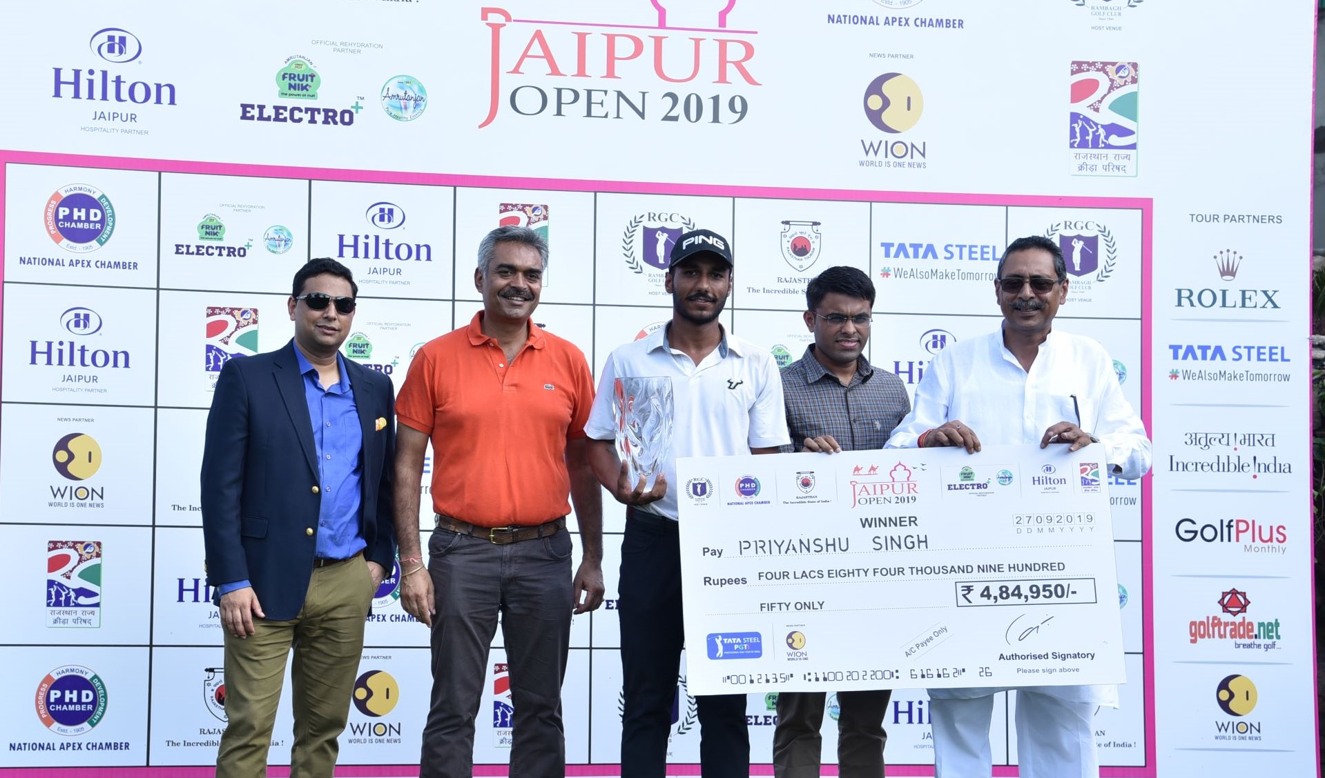 Jaipur Open: Priyanshu Singh receives the winning cheque from Shri Vishvendra Singh, Minister of Tourism, Govt of Rajasthan (extreme right) & Dr. Bhanwar Lal, Director - Tourism, Govt of Rajasthan
