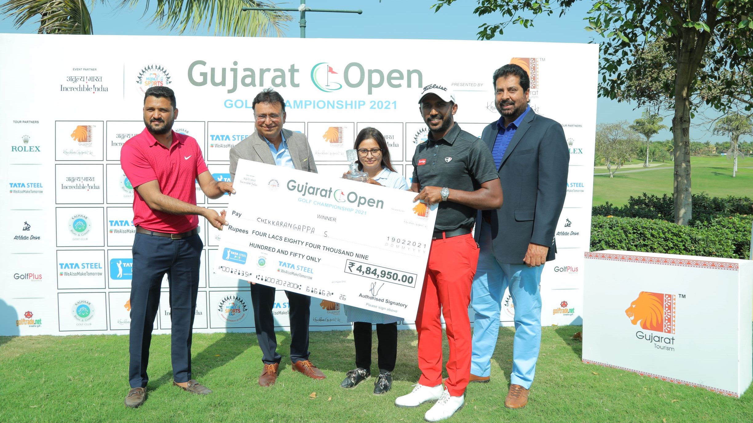 Gujarat Open Presented by Gujarat Tourism: Chikkarangappa receiving the winner's cheque from Ms. Khyati Nayak, Manager - Marketing, Niche Tourism, Gujarat Tourism (centre), Mr. Devang Shah, MD, Navratna Group (2nd from left) and Mr. Samir Panchal, Coach - Sports Authority of Gujarat (extreme left). Also seen in the picture is Mr. Uttam Singh Mundy, CEO, PGTI (extreme right)