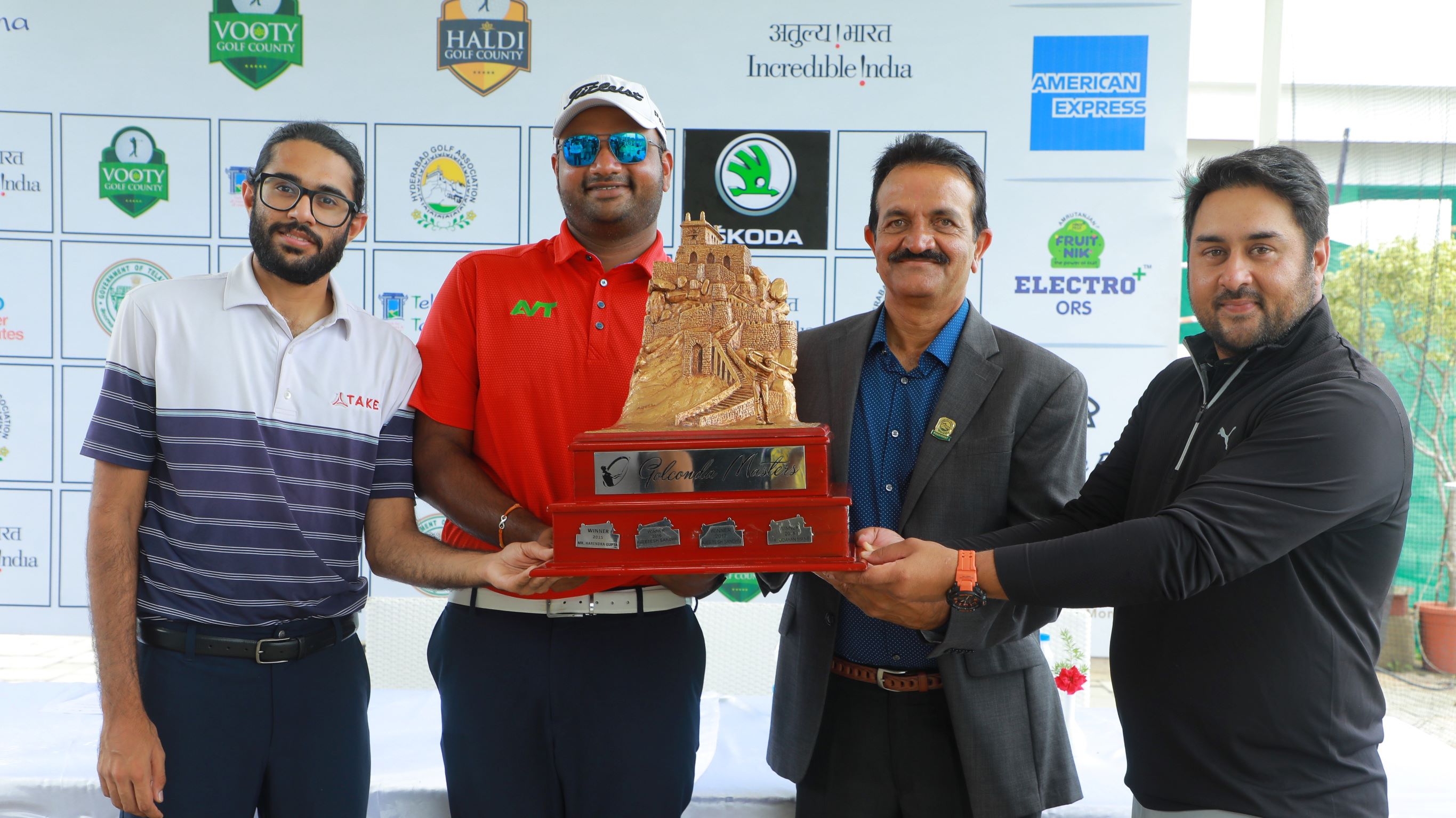 Golconda Masters Telangana Open 2021 Presented by Vooty & Haldi: L - R: PGTI Order of Merit leader Karandeep Kochhar, Olympian and Defending Champion Udayan Mane, Mr. C Dayakar Reddy, President, HGA & Mr. Rupinder Singh Gill, GM, Vooty Golf County, pose with the trophy