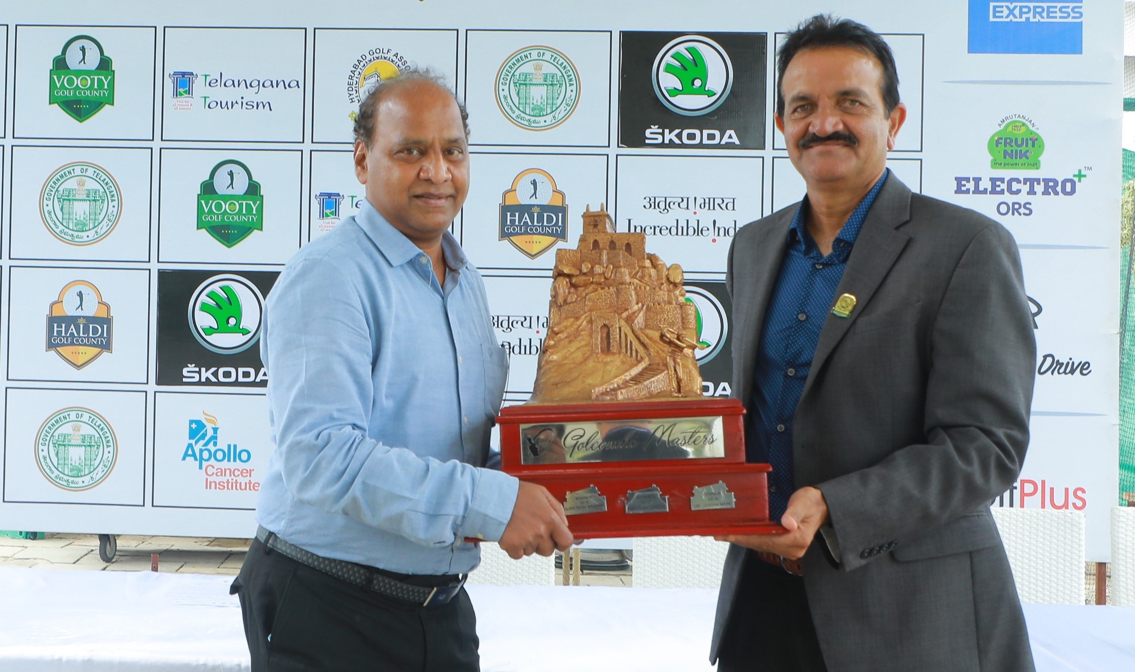 Golconda Masters Telangana Open 2021 Presented by Vooty & Haldi: (L - R) Shri K S Sreenivasa Raju, IAS, Secretary to Government of Telangana, Youth Advancement, Tourism & Culture Department & Mr. C Dayakar Reddy, President, HGA, pose with the trophy