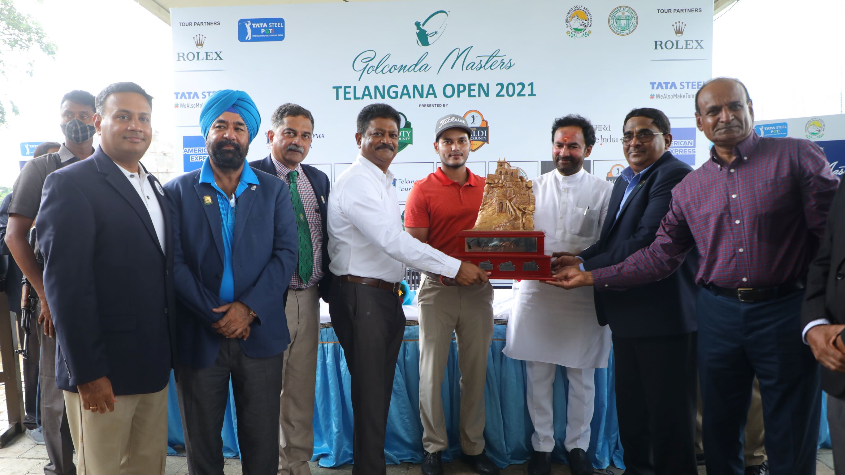 Golconda Masters Telangana Open 2021 Presented by Vooty & Haldi: Manu Gandas receives the trophy from Shri G Kishan Reddy, Hon'ble Minister of Tourism, Govt of India (3rd from right) and Mr. K Santosh Reddy, Chairman, Dream Valley Golf & Resorts (4th from left)
