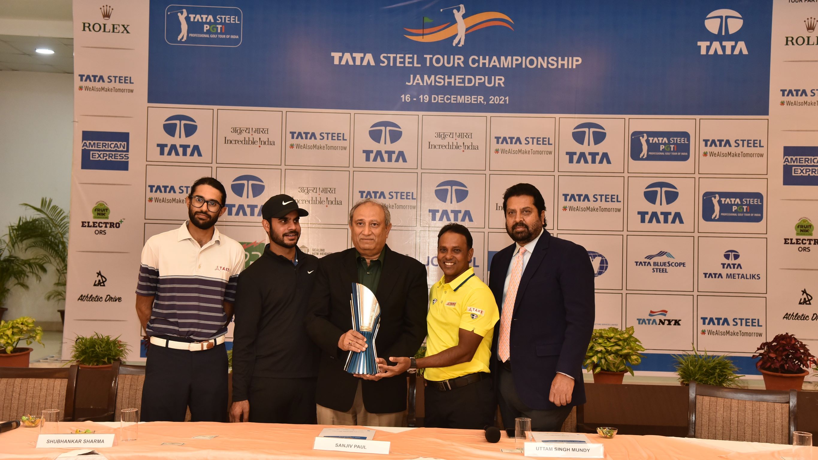 TATA Steel Tour Championship 2021: (L to R): Karandeep Kochhar, Shubhankar Sharma, Mr. Sanjiv Paul, Vice President (Safety, Health & Sustainability), TATA Steel and Captain, jamshedpur Golf, SSP Chawrasia and Mr. Uttam Singh Mundy, CEO, PGTI, pose with the trophy at the Press Conference on Monday