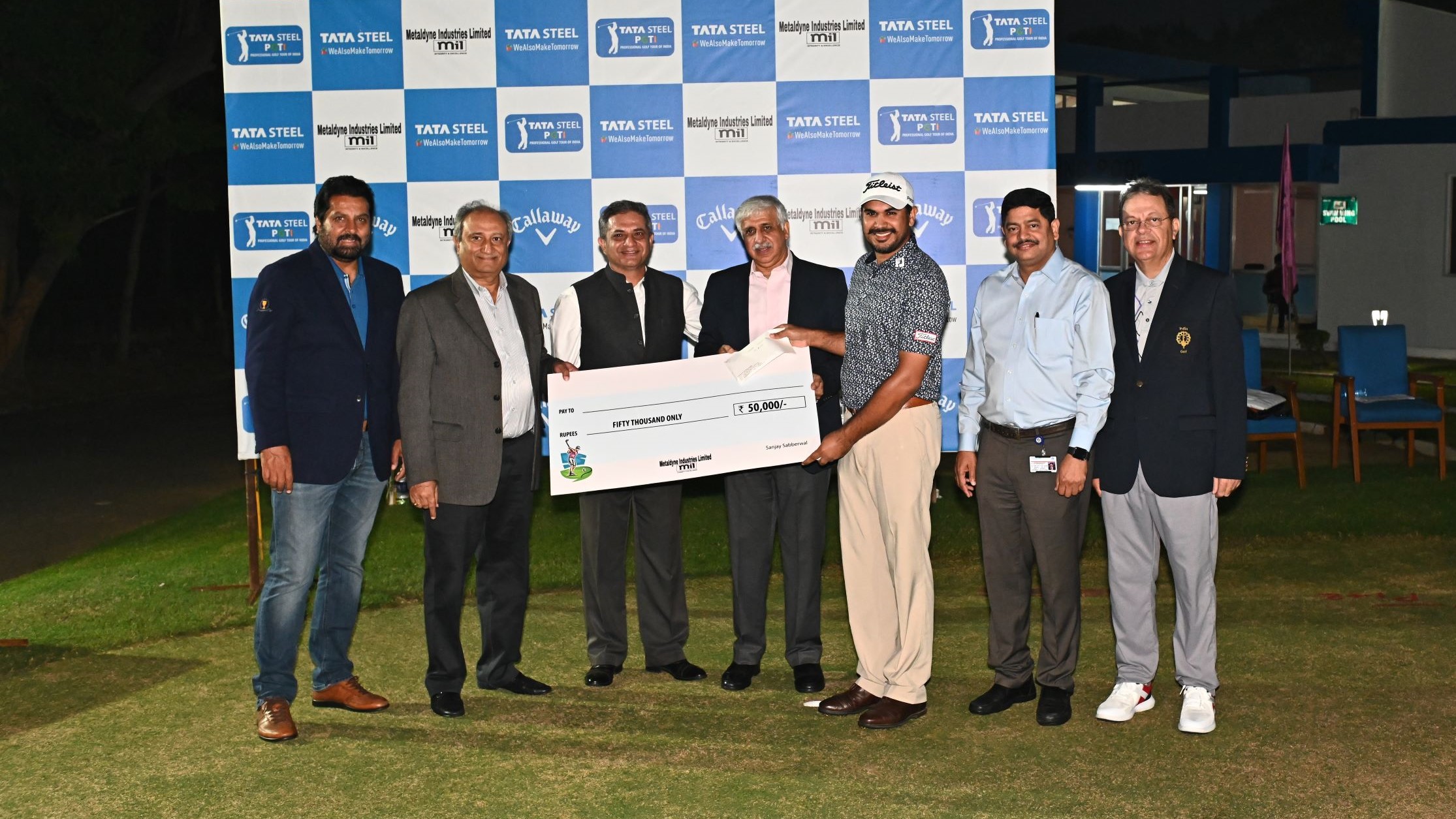 TATA Steel Tour Championship 2021: Gaganjeet Bhullar, the winner of the 'Putting Competition for the Legends', receives the winning cheque from Mr. Chanakya Chaudhary, Vice President (Corporate Services), TATA Steel (4th from left), Mr. Sanjiv Paul, Vice President (Safety, Health & Sustainability), TATA Steel (2nd from left) and Mr. Sanjay Sabarwal, Director, Metaldyne Industries Limited (3rd from left)