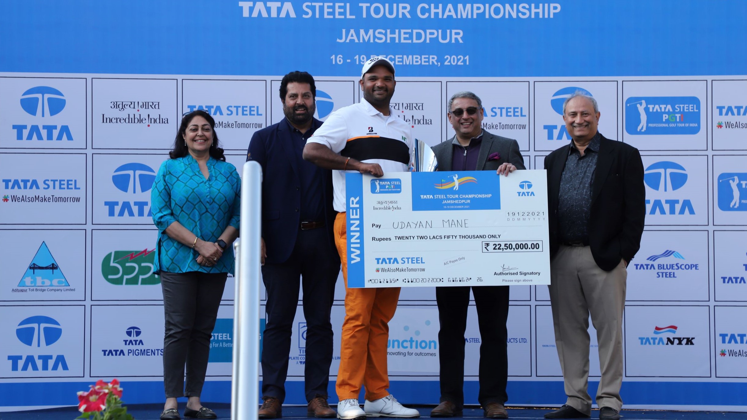 TATA Steel Tour Championship 2021: Udayan Mane receives the winner's cheque and trophy from Mr. T V Narendran, CEO & MD, TATA Steel. The other dignitaries in the picture are Mr. Sanjiv Paul, Vice President (Safety, Health & Sustainability), TATA Steel (extreme right), Mrs. Ruchi Narendran (extreme left) and Mr. Uttam Singh Mundy, CEO, PGTI (2nd from left).