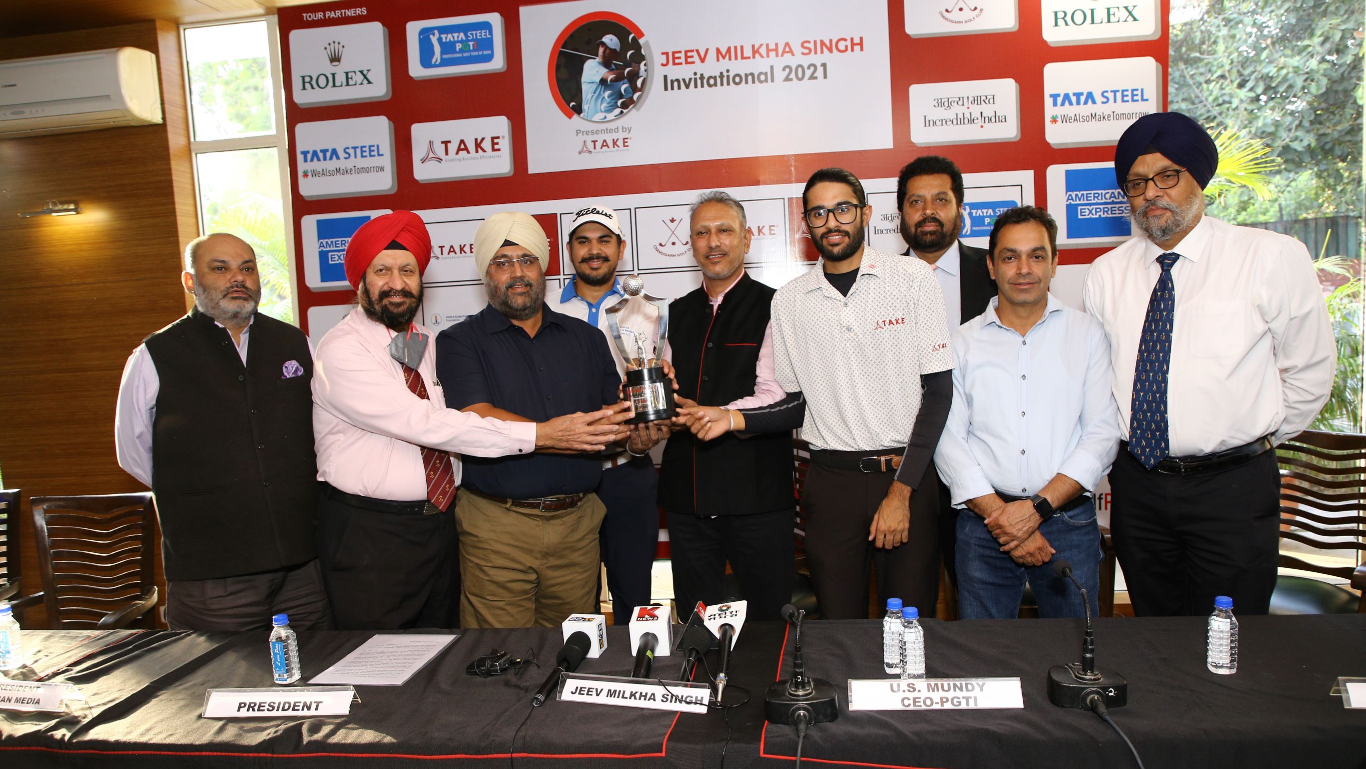 Jeev Milkha Singh Invtl 2021 Presented by TAKE Sports: L - R: K S Sibia, Hony. Secy., Chandigarh GC, Dr. G S Kochhar, Vice President & Chairman, Media, Chandigarh GC, Ravibir Singh, President, Chandigarh GC, Gaganjeet Bhullar, tournament host Jeev Milkha Singh, defending champion Karandeep Kochhar, U S Mundy, CEO, PGTI, Arvind Bajaj, Captain, Chandigarh GC & G S Bakshi, Chairman, Tournaments & Handicapping, Chandigarh GC, pose with the trophy of the Jeev Milkha Singh Invitational 2021 Presented by TAKE Sports during the press conference on Tuesday
