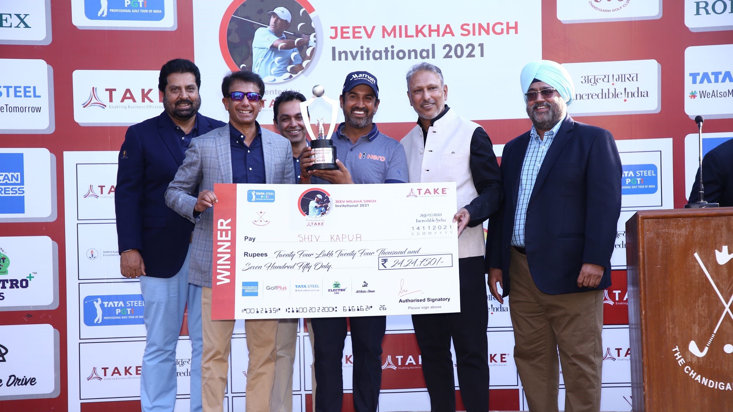 Jeev Milkha Singh Invtl 2021 Presented by TAKE Sports: Shiv Kapur receives the winner's cheque and trophy from Mr. Srinivasan H R, Director, TAKE Sports Management Pvt. Ltd. (2nd from left) and Indian golf legend and tournament host Mr. Jeev Milkha Singh (2nd from right). The others seen in the picture are Mr. Uttam Singh Mundy, CEO, PGTI (extreme left), Mr. Arvind Bajaj, Captain, Chandigarh GC (3rd from left), Mr. Ravibir Singh, President, Chandigarh GC (extreme right).