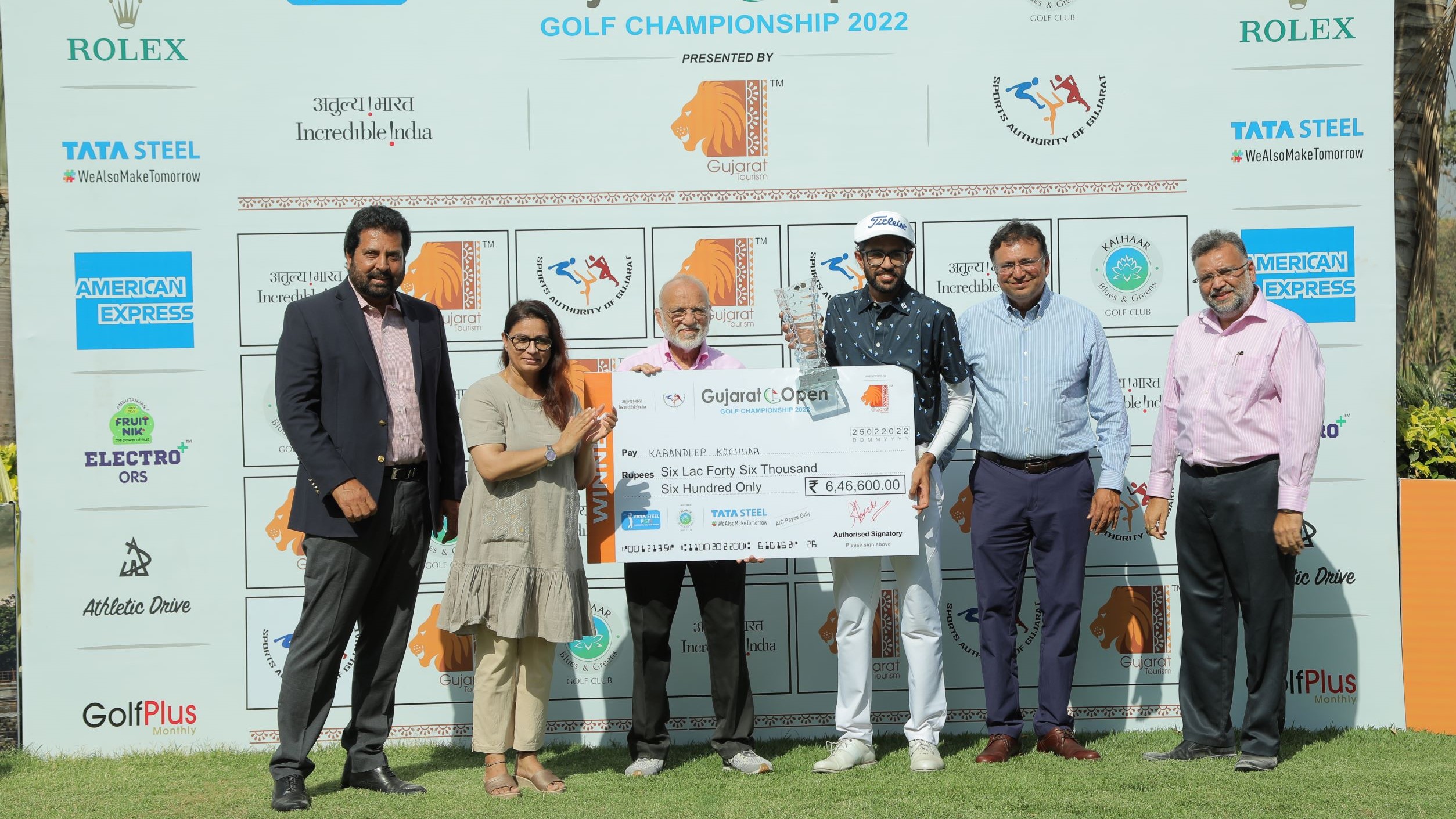 Gujarat Open Presented by Gujarat Tourism: Karandeep Kochhar receives the winning cheque and trophy from Ms. Khyati Nayak, Head - Business Development, Gujarat Tourism (2nd from left) and Mr. Dinesh Shah, Chairman, Navratna Group (3rd from left). The other dignitaries seen in the picture are Mr. Devang Shah, MD, Navratna Group (2nd from right), Mr. Pranav Shah, MD, Navratna Group (extreme right) and Mr. Uttam Singh Mundy, CEO, PGTI (extreme left).