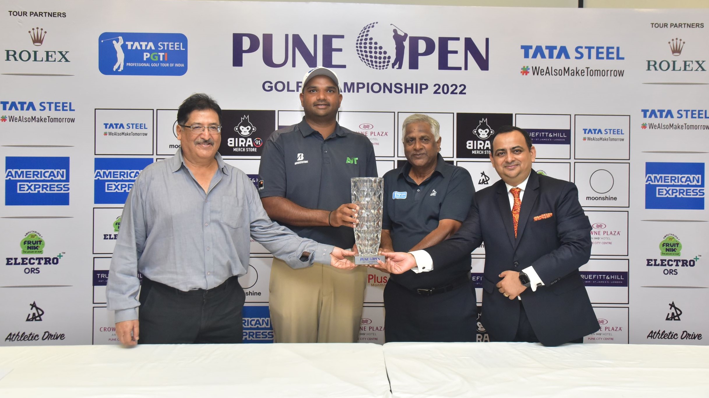 Pune Open 2022: L - R: Mr. Ikram Khan, Captain, Poona Club Golf Course, Olympian Udayan Mane, Mr. Sampath Chari, Tournament Director, PGTI and Mr. Anurag Raha, GM, Crowne Plaza Pune City Centre, pose with the trophy at the Press Conference of the Pune Open Golf Championship 2022 on Tuesday